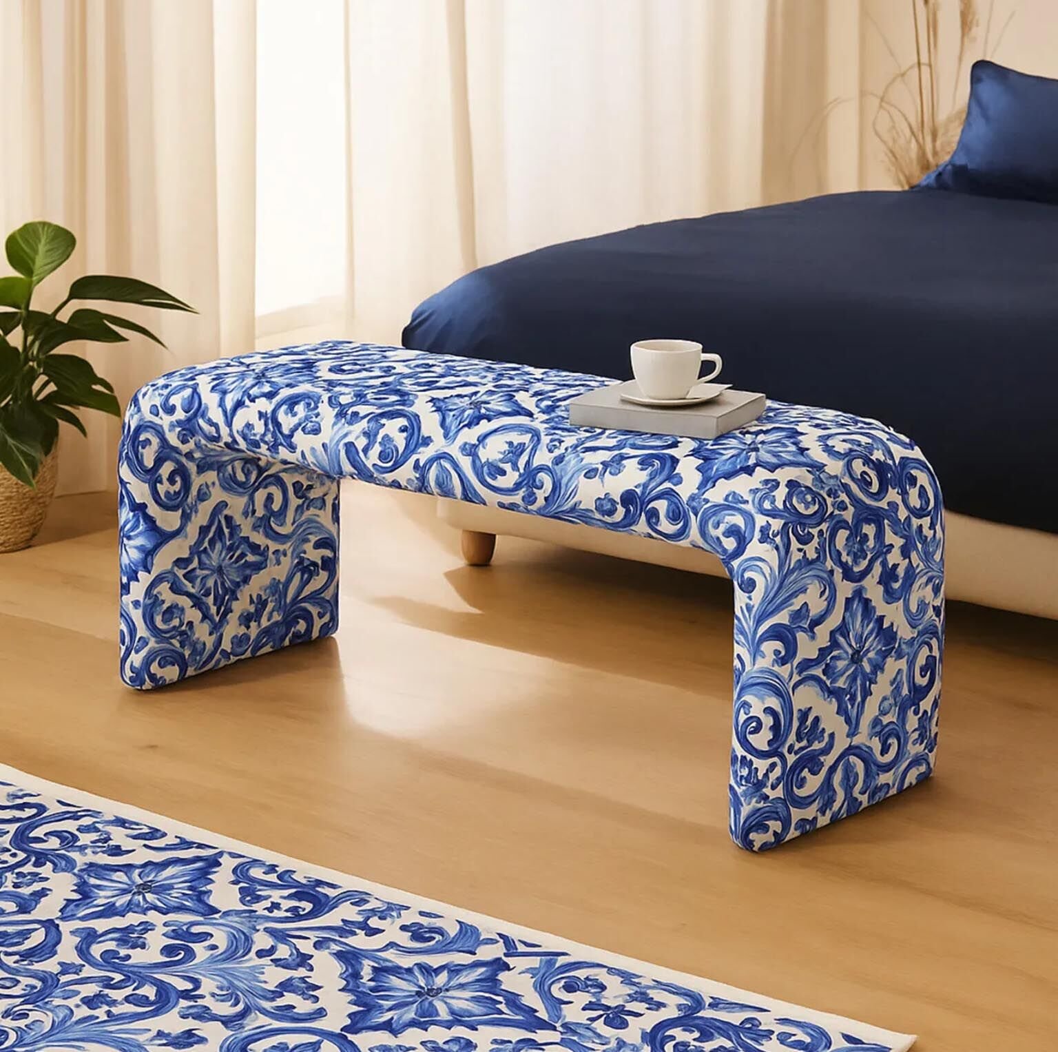 - Mavi beyaz desenli kadife kumaşı ile şık ve modern bir görünüm sunar. - Oval formu sayesinde mekanınıza zarif bir dokunuş katar. - Plastik ayak malzemesi, dayanıklılığı artırırken kolay temizlenebilirliği sağlar. - 120 x 45 cm boyutlarındaki geniş tasarımıyla rahat oturma alanı sunar. - 2 yıl garanti süresiyle uzun ömürlü kullanım vaat eder. - İskandinav stilinin sadeliğini yansıtan tasarım, evinizin dekorasyonuna uyum sağlar. - Ahşap gövde materyali doğal bir estetik katarken, dayanıklılığı arttırır. - Modern stil sahibi bu puf bench, çağdaş yaşam alanlarının vazgeçilmezi olacak. - Web color mavi rengiyle huzur verici bir atmosfer oluştururken, standart özellikleriyle her türlü ihtiyaç için uygundur.